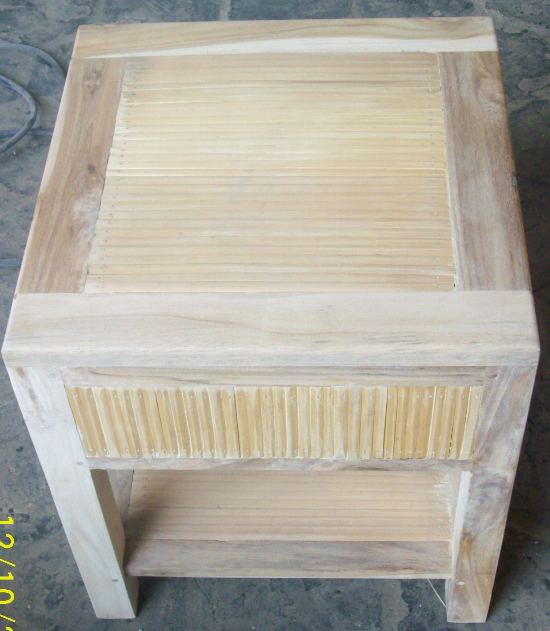 Amplas permukaan kayu pada furniture bambu dengan kombinasi jati searah serat sampai benar-benar halus dan rata.