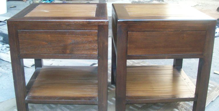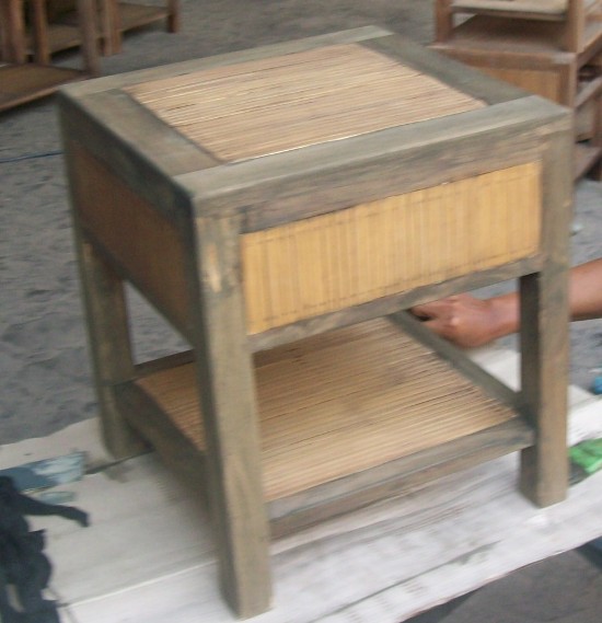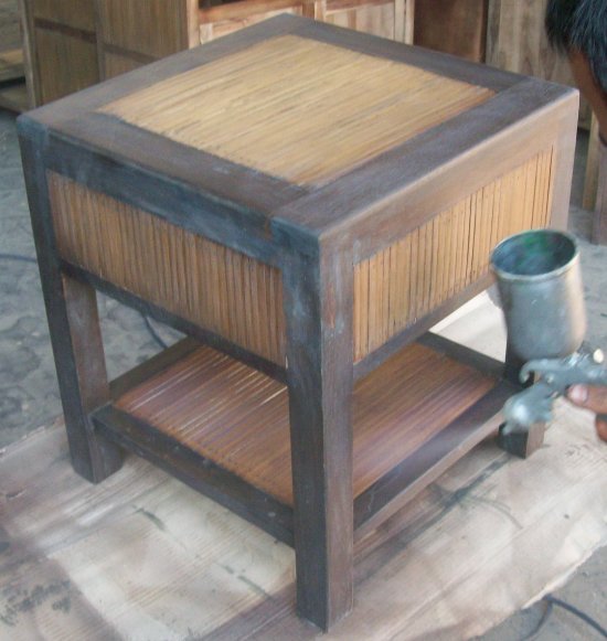 finishing warna colonial teak pada furniture bambu dengan kombinasi kayu jati dengan bahan Biovarnish Water based wood coating spray system
