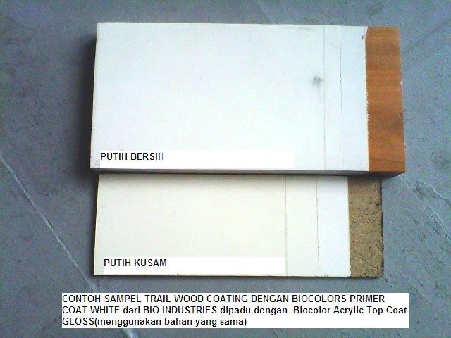 Pernah suatu ketika seorang konsumen dari BIO Industries (water based paint and coating) bertanya-tanya kepada kami. Ia bertanya mengapa ketika dia membuat sebuah trial coat finishing dengan warna putih solid, waktu itu menggunakan Bioduco primer coat white solid dipadu dengan Bioduco Acrylic Top Coat GLOSS menghasilkan sebuah paduan yang sempurna yaitu putih bersih dan cerah.